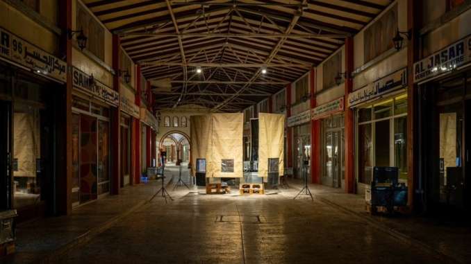 Aziz Hazara has a modest yet dynamic installation in the Old Al Jubail Vegetable Market to chronicles the afterlife of Bagram, site of notorious US and NATO military installations during the Afghan war. Hazara’s I Love Bagram (2025 – above), Bagram Field Notes (2021–ongoing) and other works ruminate on the impact of military intervention through what is left behind – clothing, tools and other everyday goods, creating a radical archive of knowledge and resistance.